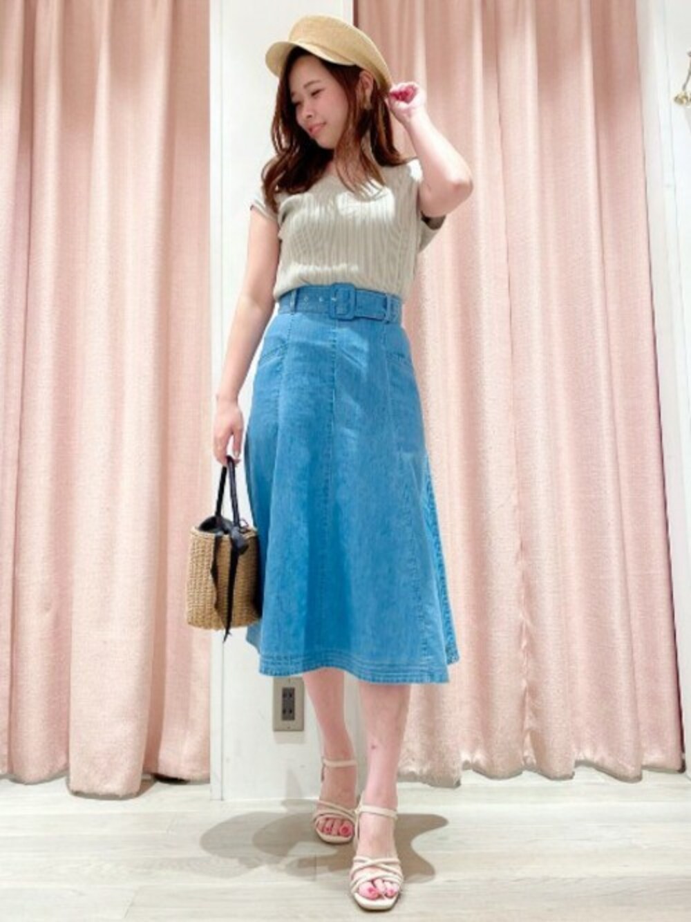 初夏を感じる♪爽やかな色味のコーディネート 素肌チラ見せニットと、ラインが綺麗なサマーデニムで大人フェミニンに。 麦わら風味のバッグ&キャスケットを合わせて季節感アップ。 夏の風情を感じさせてくれます☆彡