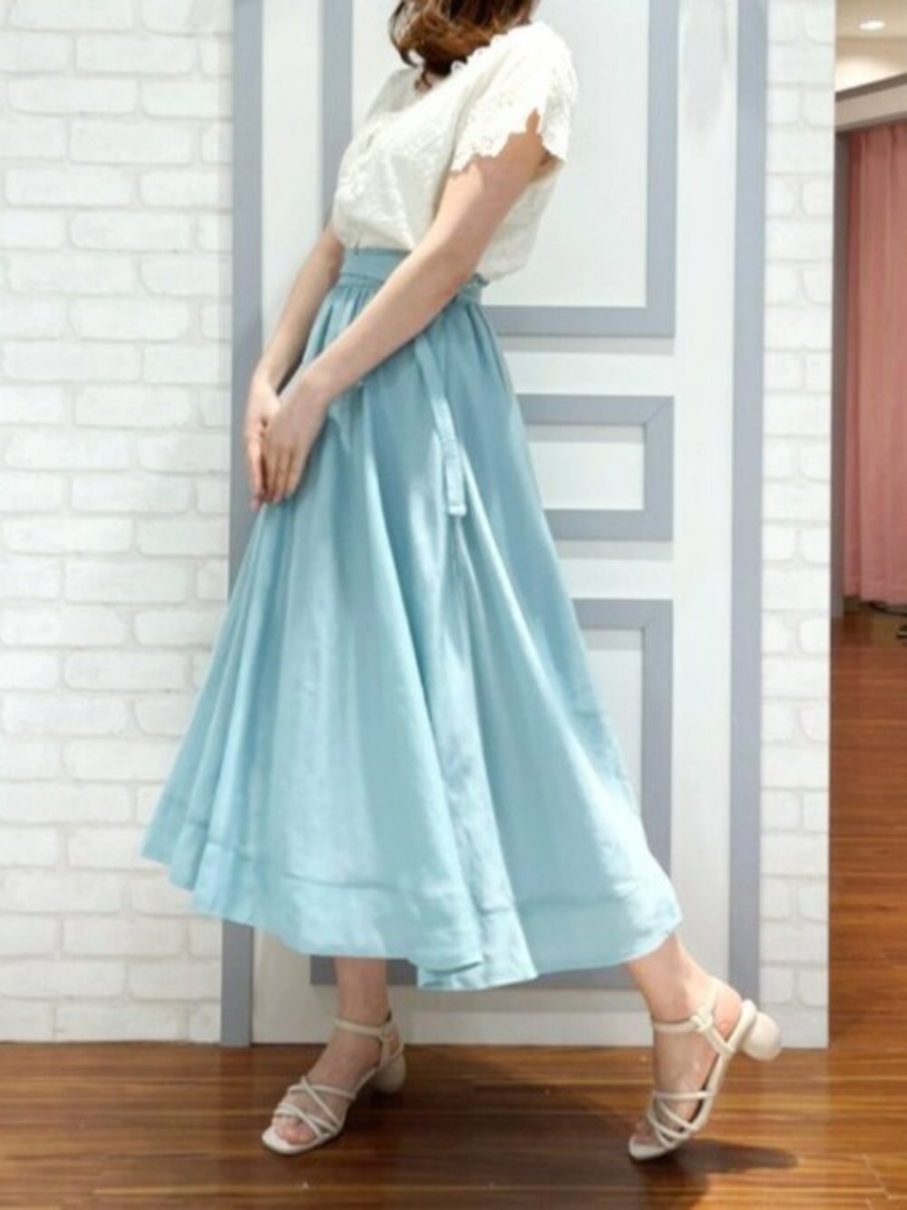 レーストップス×カラースカートで綺麗めコーデ ホワイト×ミントで夏の清涼感を演出! ウエストスッキリ、ふんわり素材感で、軽い着用感のスカート。 二の腕を適度に隠してくれるのが嬉しいトップス。 夏に向けてオススメです♪