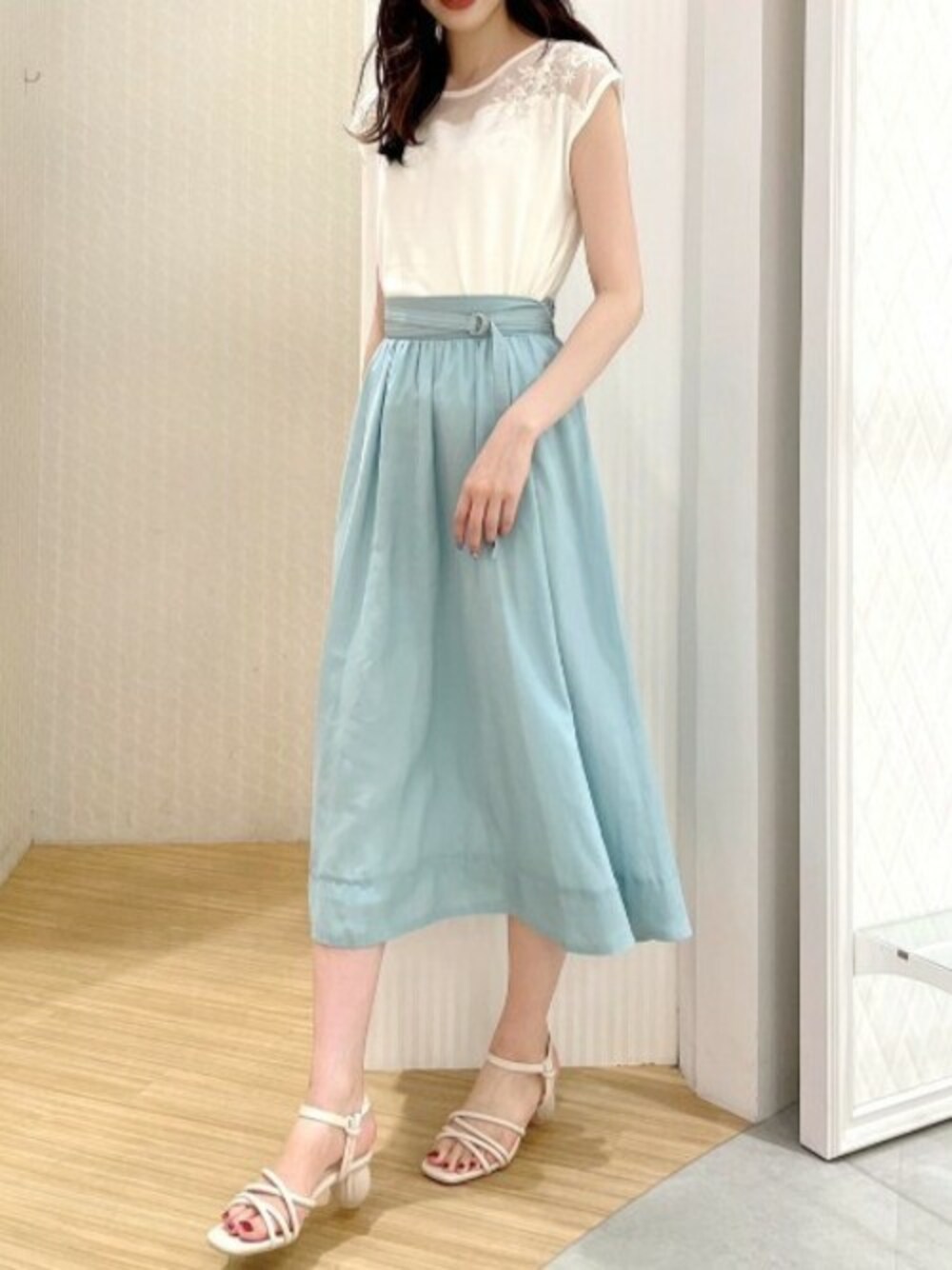 爽やかフェミニンコーデ クチュール感のあるデコルテと、 スカートのきれいな揺れ感がpoint♪
