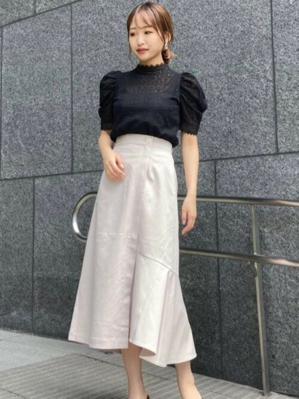 レースブラウス♪ パフスリーブと総レースが上品さをグンとUP! インナー付きなので透け感も程よくおしゃれ♪ ラップスカートsサイズ アシンメトリーな裾が動きがあって女性らしい印象に! シンプルなので色んなコーディネートで楽しめます♪