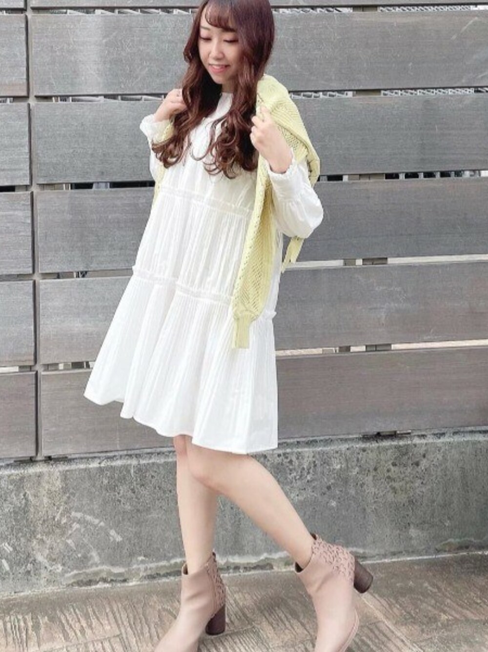 ふんわりプリーツワンピに、パステルカラーニットで春めくコーデ♪