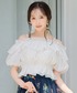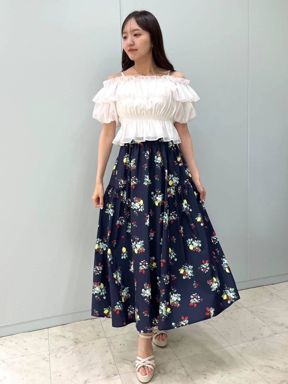 脚長効果抜群のフェミニンコーデ。 ペプラムデザインのトップスは、シャーリング仕様でフィット感があり、肩紐が付いているのでオフショルでも安心です。 鮮やかなフルーツ柄が目を引くスカートは、軽い素材感なのでフレアが綺麗に広がります。