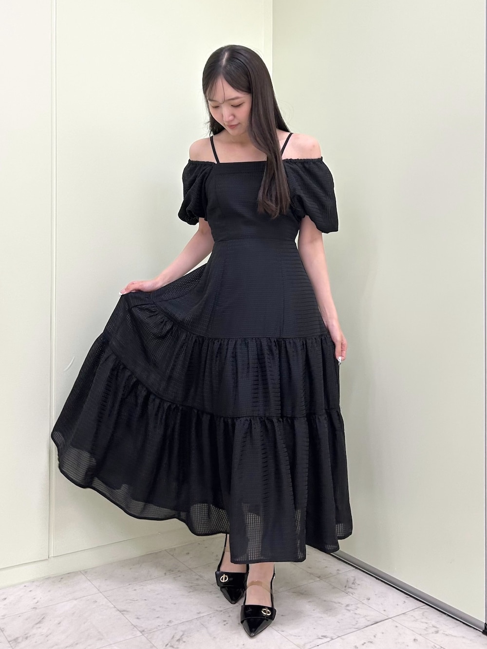 2wayで着られるティアードワンピース。 バルーンスリーブの肩口部分はゴム仕様なので、スクエアネックとオフショル風にアレンジが可能です。 軽く涼しげな生地は、表面感のある生地なので一枚でも単調になりにくいです!