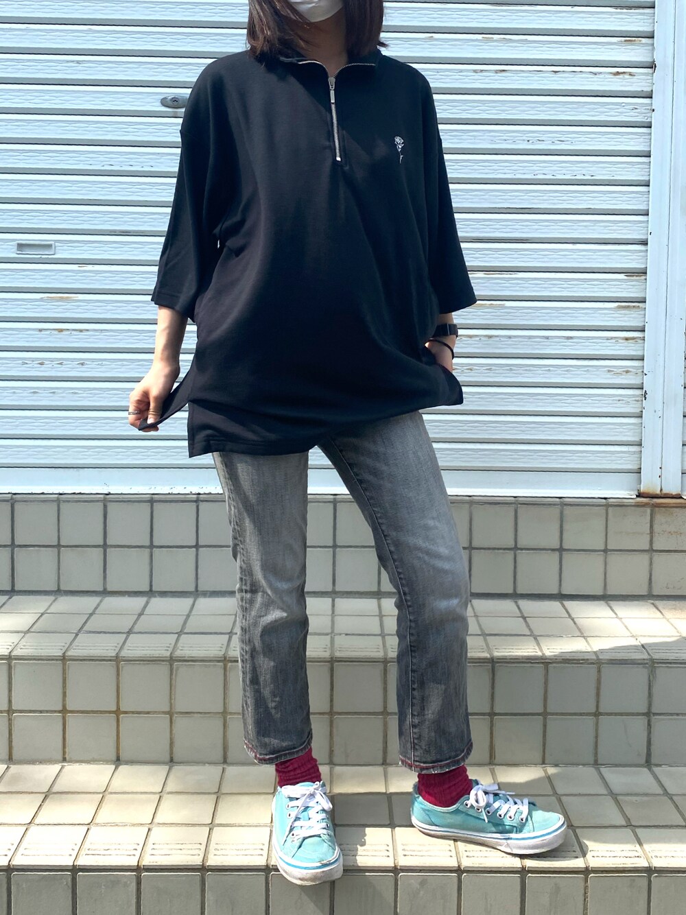 焼きどんぐりのTシャツ/カットソー「Big silhouette rose stitch half zip T shirt / ビッグシルエット バラ刺繍 ハーフジップ ワンポイント刺繍 半袖 Tシャツ」を使ったコーディネート