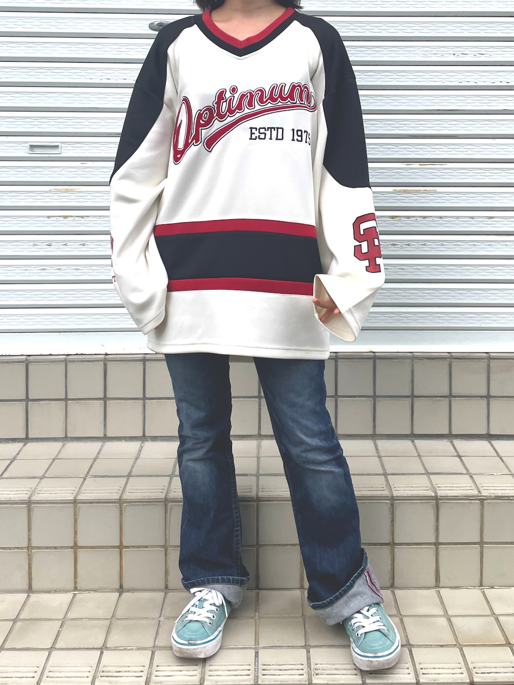 焼きどんぐりのスウェット「wide silhouette wappen hockey shirt/ワイドシルエット ワッペン ホッケー シャツ」を使ったコーディネート