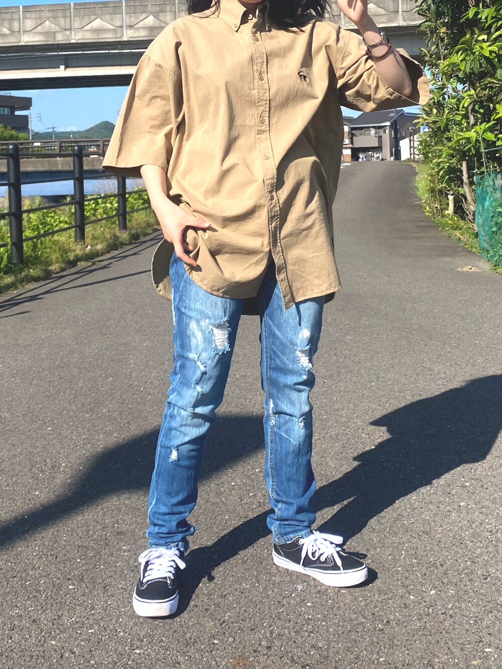 焼きどんぐりのデニムパンツ「ダメージスキニーデニム」を使ったコーディネート