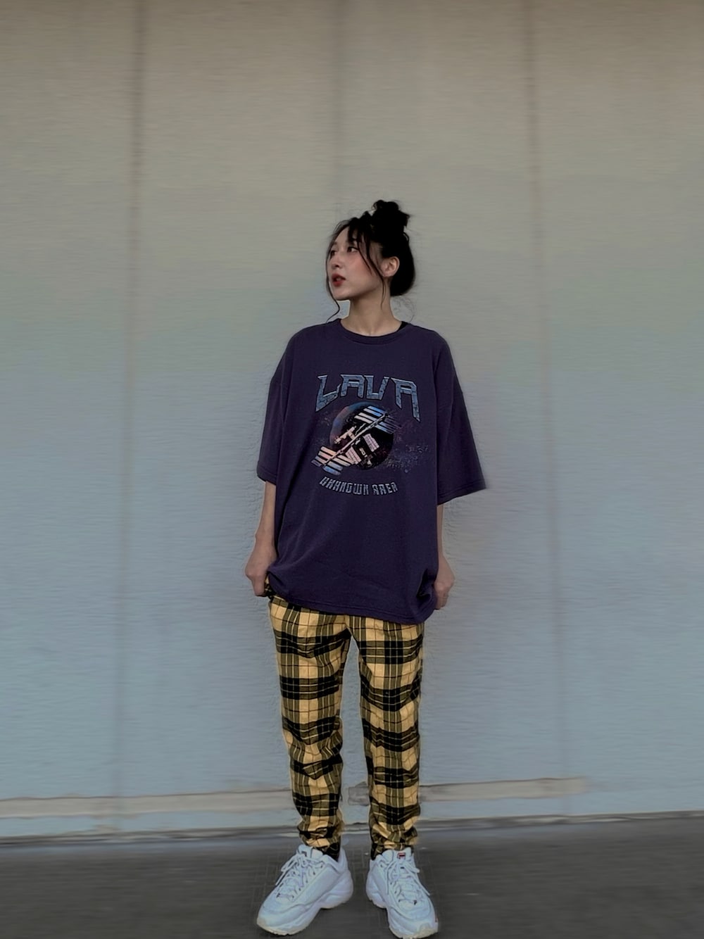 プリントTとチェックパンツでアメカジコーデ💜💛 レザーパンツとか合わせたら韓国風にもなりそう🪄︎︎◝✩ プリントT 1枚で色々と楽しめそう✌🏻 ̖́-