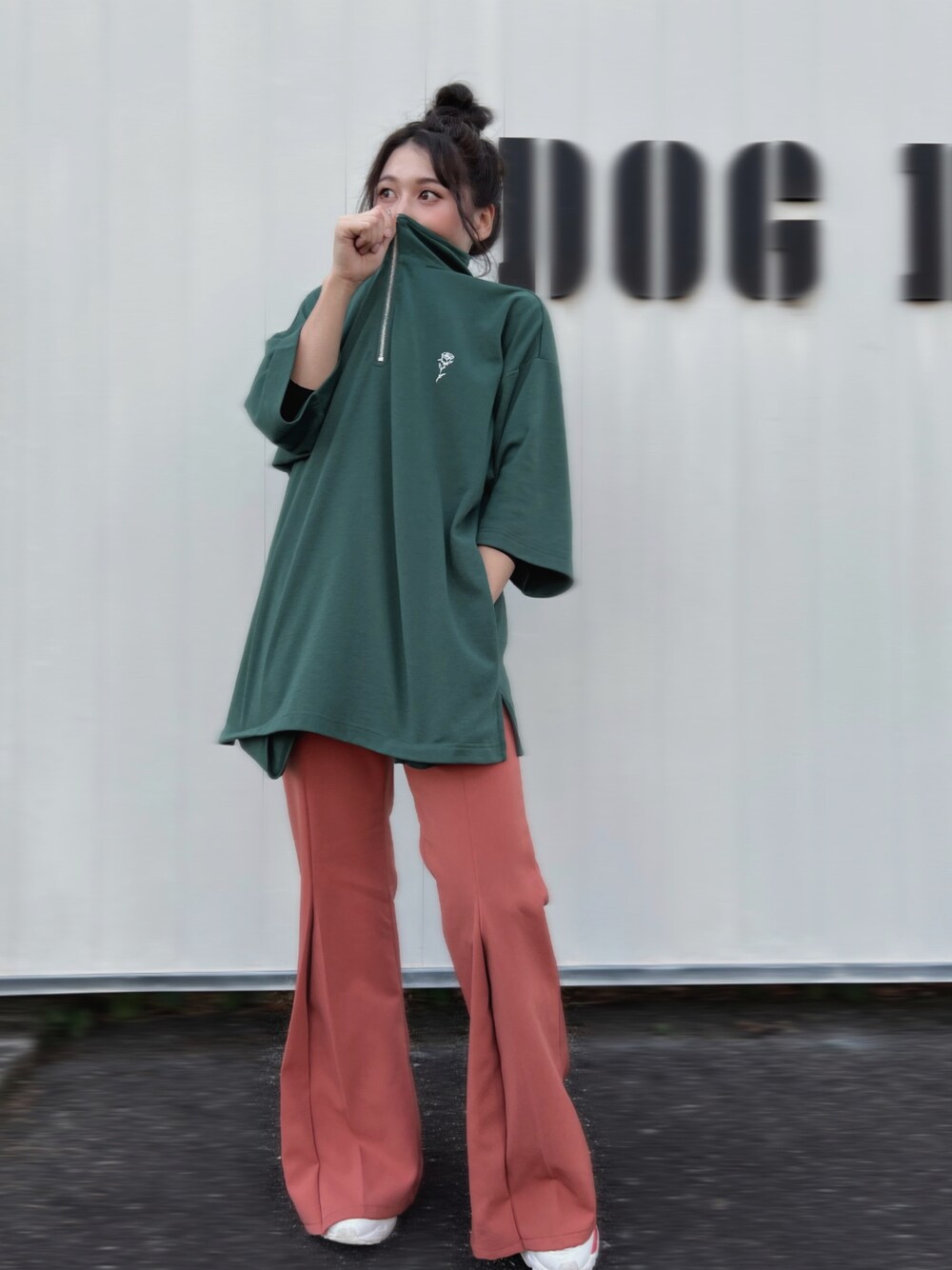 JuriのTシャツ/カットソー「Big silhouette rose stitch half zip T shirt / ビッグシルエット バラ刺繍 ハーフジップ ワンポイント刺繍 半袖 Tシャツ」を使ったコーディネート