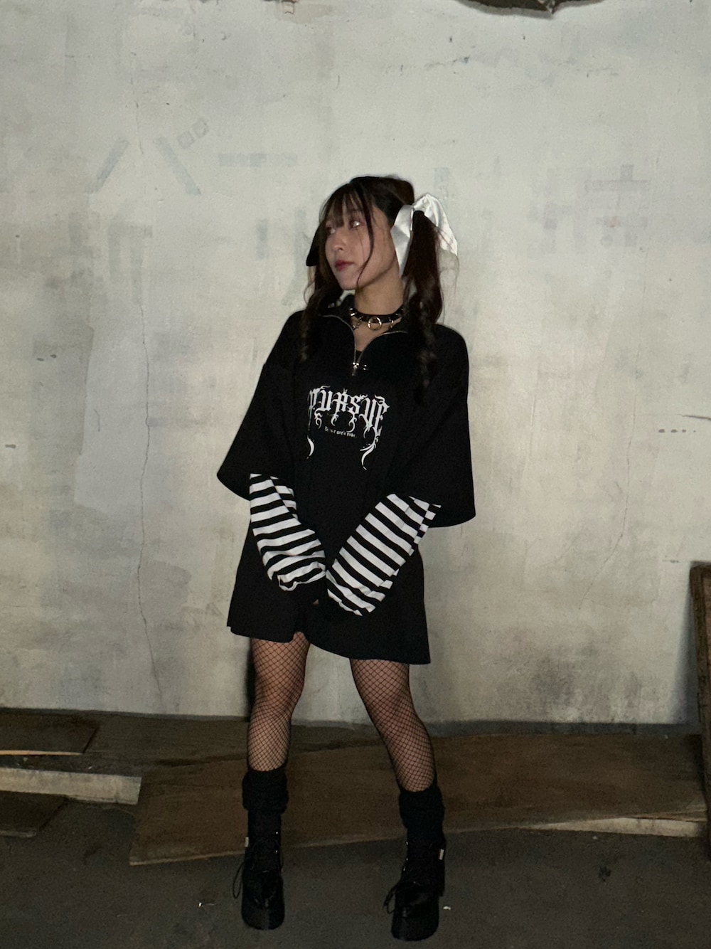 トレンドのハーフジップで 地雷系コーデ! 袖切り替えになってて 地雷MAXの白黒でまとめてみました🤍🖤