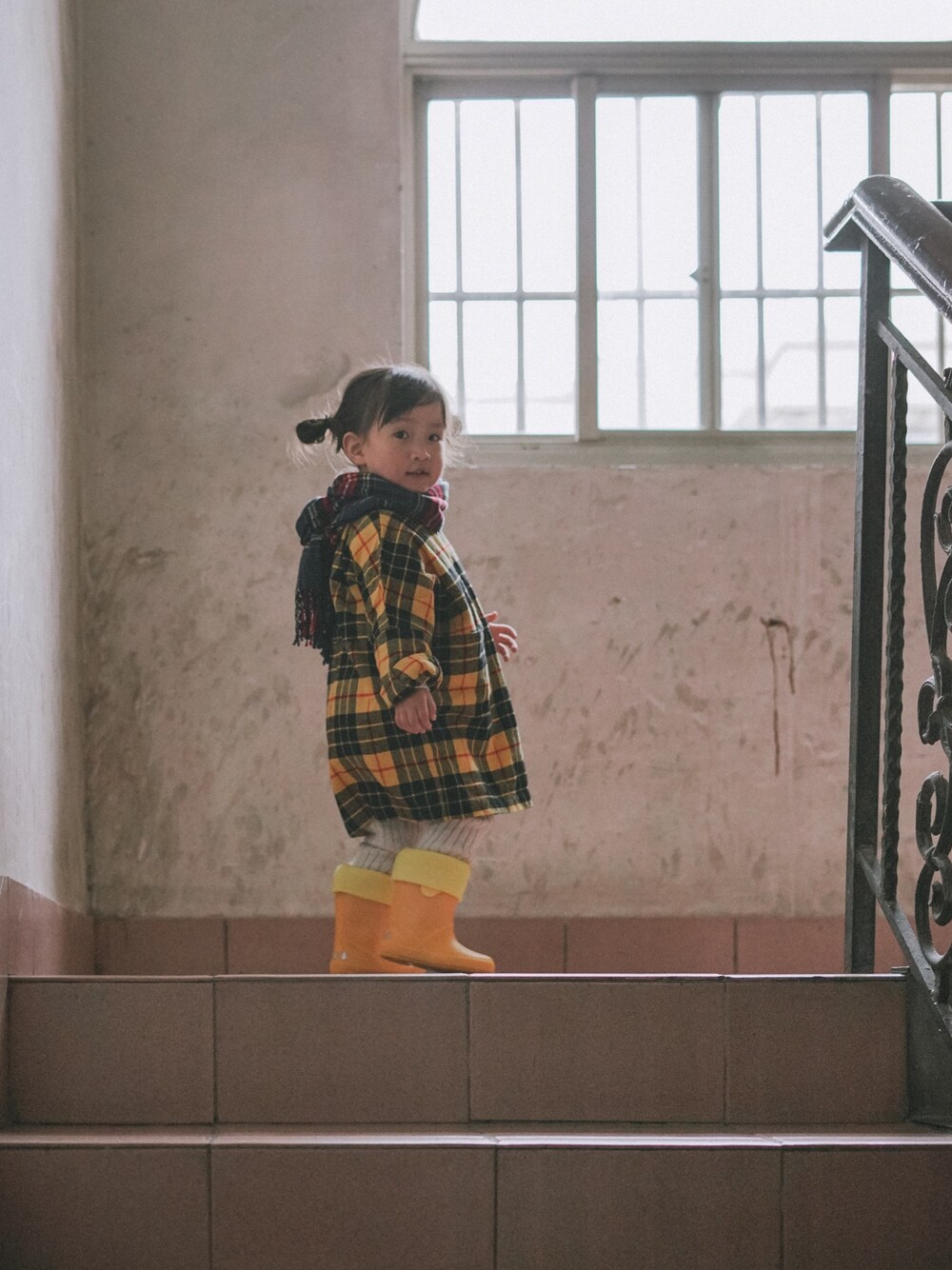 虽然看不见阳光, 阴天的光线也还不错 姜黄色大格子裙+套鞋 显的元气满满