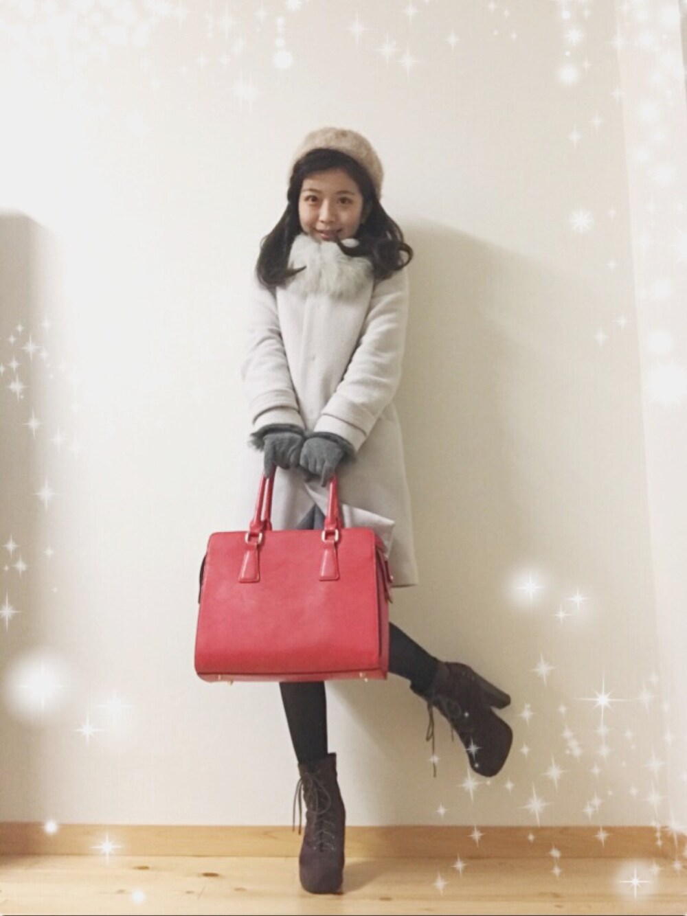 Little lady えりいのステンカラーコート「ラメブークレーコート」を使ったコーディネート