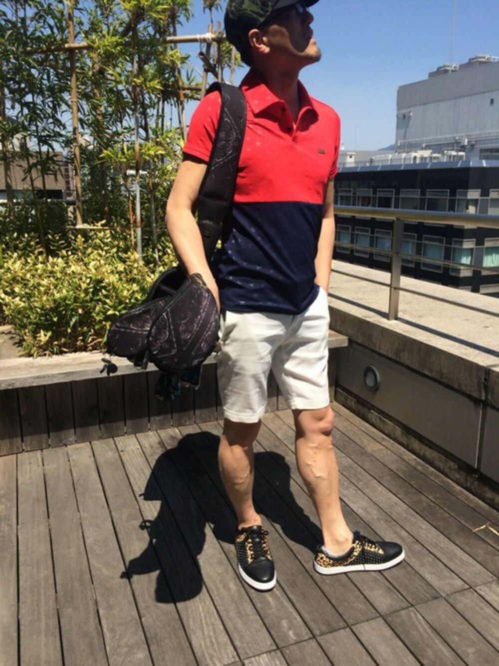 バイカラーポロシャツ。生地全体にスター(☆星柄)のエンボス加工でアクセント。 ボトムは、ホワイトのショーツで爽やかに