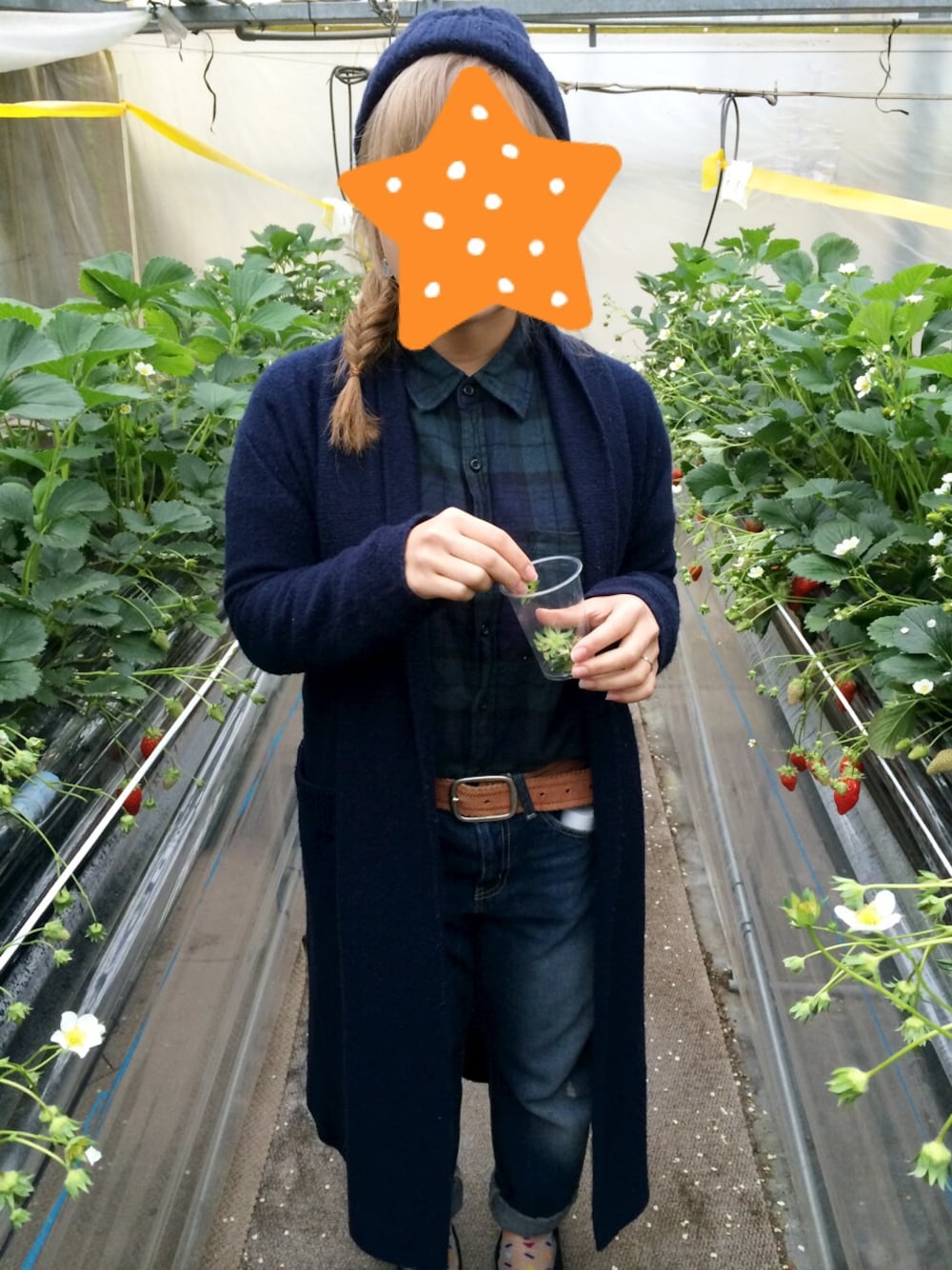 イチゴ狩り。笑 チェックシャツ久々だた( ^ω^ )笑 四月から黒髪だよー。。