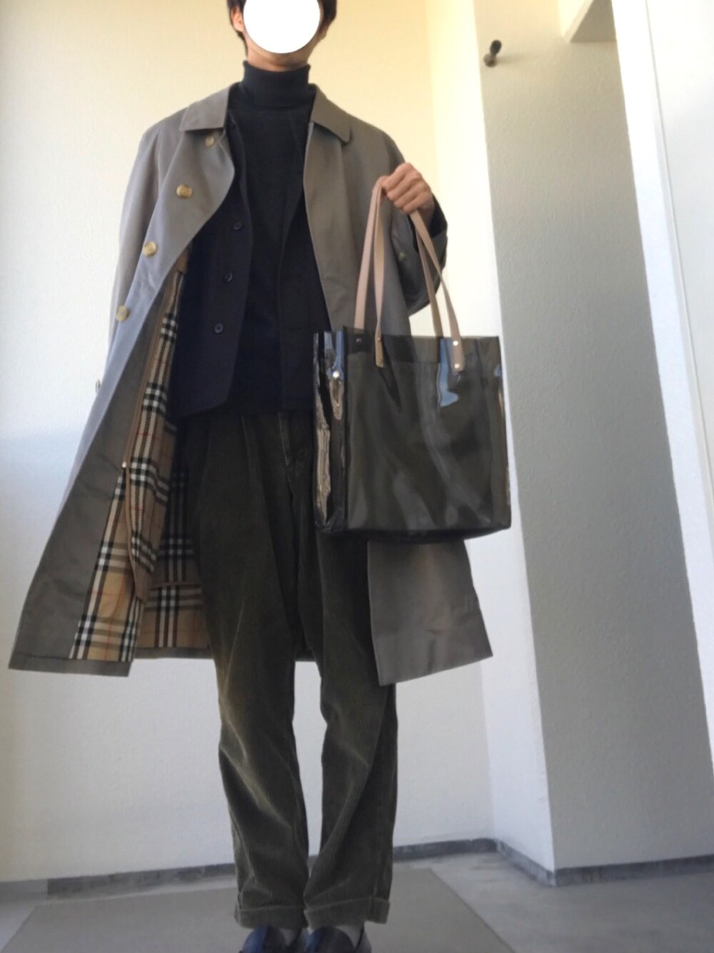 カーキ×グレーコーデ。 大人らしさ表現しました。。 クリアバッグがアクセント!