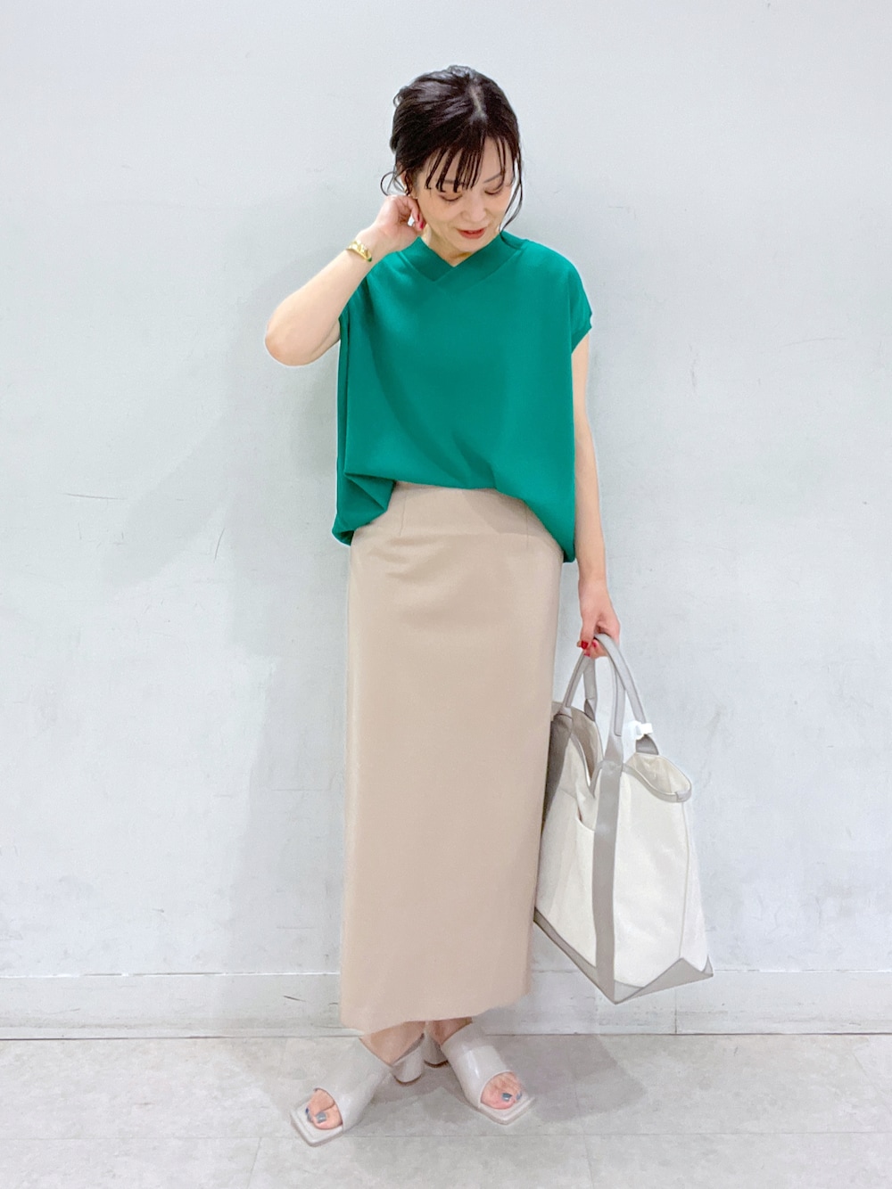 夏の定番になりつつある、接触冷感素材のニット。 ゆるっと着られて涼しく、体のラインが響かないので安心☺︎ ちょこっとある袖が二の腕をカバーしてくれます。 ジャージみたいな素材のスカートはゴム仕様で楽ちん。 ストレッチ+スリットで歩きやすいです。 素材的にラインが響くかな?と思いましたが程よく肉厚な素材なので36サイズでも大丈夫そうです。 (私は普段は36サイズですが、タイトスカートはシルエットか気になるので38サイズを履くことが多いです)