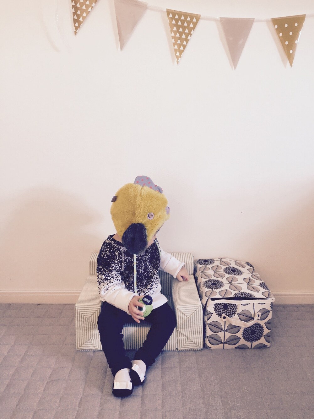 私の好みでムスメなのに、どうしてもムスコテイストになってしまう(,,꒪꒫꒪,,) なのでスウェットはオーバーサイズでスウェットワンピのように、帽子は、ふざけたダサ可愛いトリ帽子で∈(oëo)∋