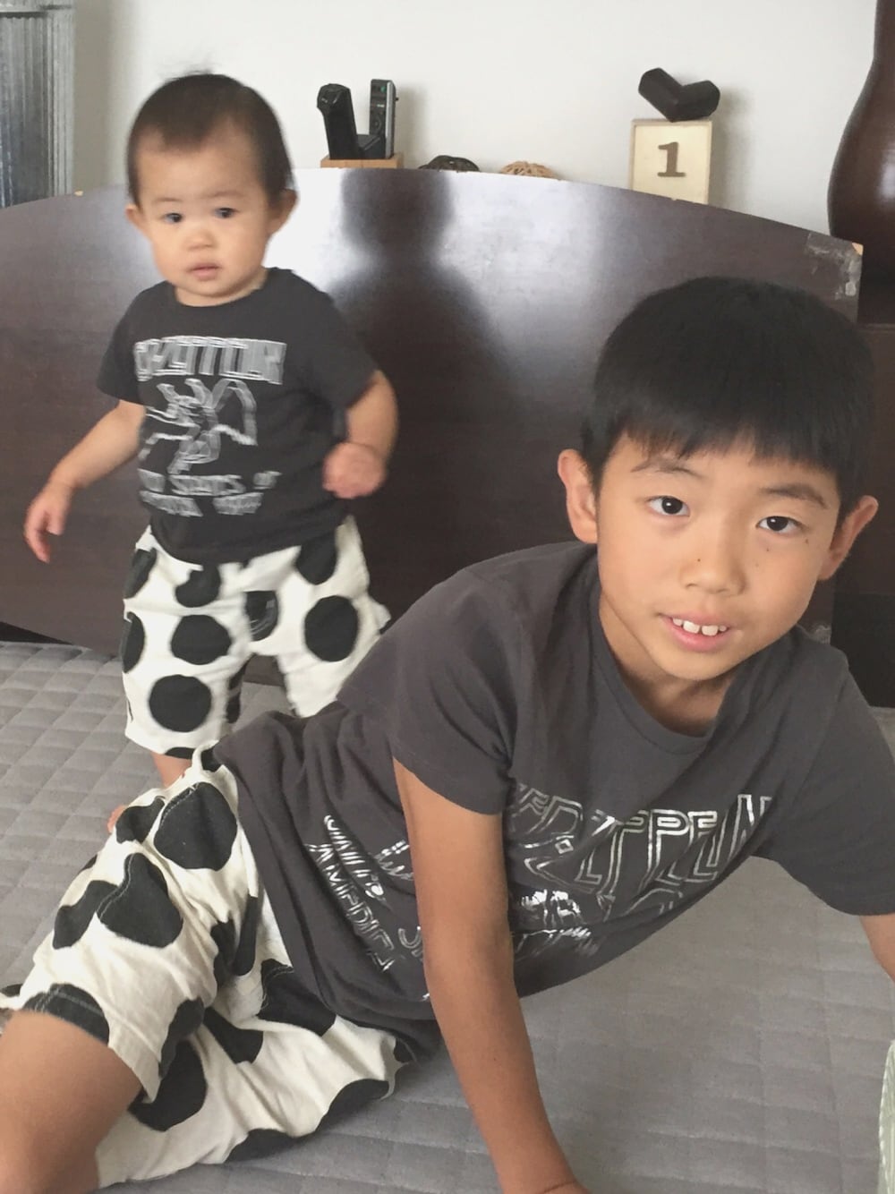 久しぶりのコーデÜP。 2年前位に買ったムスコのパンツと、今季のセールで買ったムスメのパンツが激似だったから、おソロコーデ完成(笑)