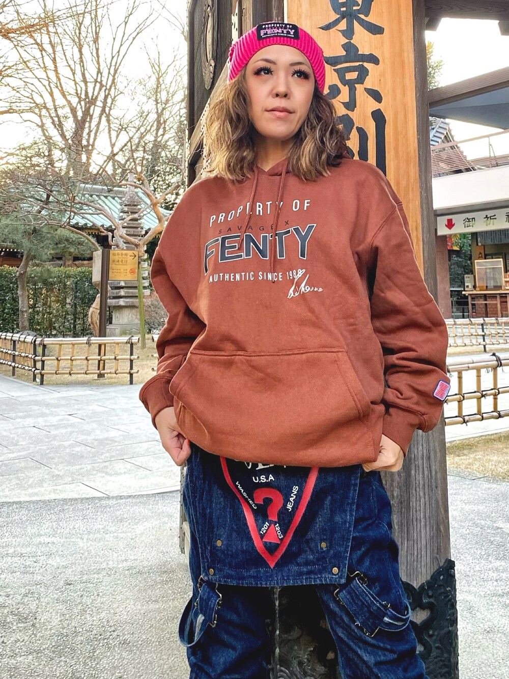 リアーナのビーニーとフーディ GuessのA$APロッキーモデル オーバーオール合わせて 夫婦コーディネート