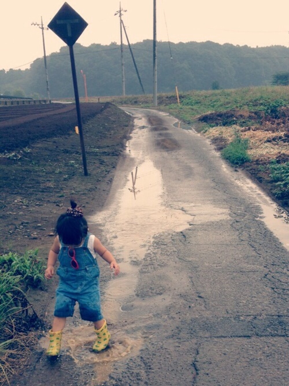 雨上がりの田舎道 水たまりにIN!! 親戚のじいちゃん、ばあちゃん達に ものすごーく得意げに サングラスをかけて見せて回っていました! みんなに「かっこいいねー!」と言ってもらえて ご満悦のととさん(*ꆤ.̫ꆤ*)