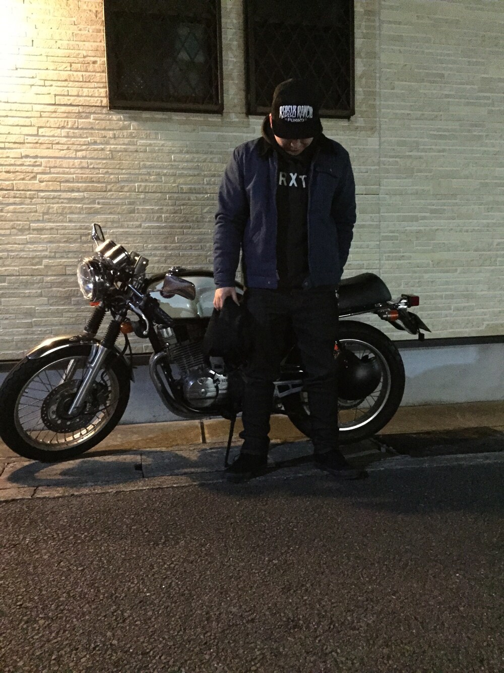 REBEL8×RANCIDのキャップにindependent×BRIXTONのアウター、BRIXTONのパーカーにVANSのスニーカー 手に持っているのはヴィヴィアンのマフラーです。