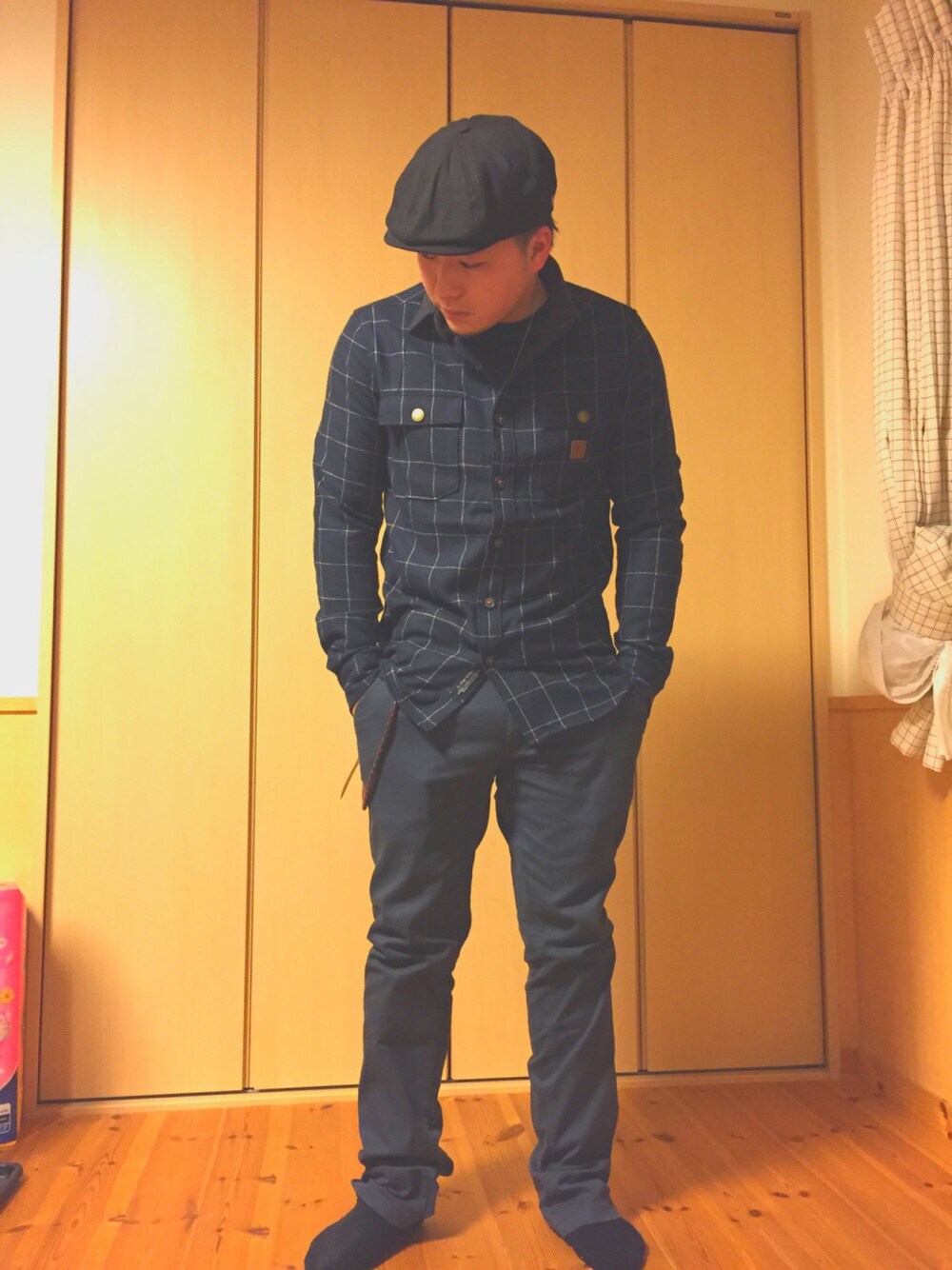 brixtonのパンツにキャスケット、トップスはROARKのシャツで、暗めに。 自分のこだわりのブランド1位と2位の組み合わせです。