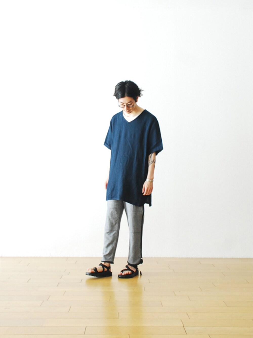 モデル 身長174cm 体重60kg 足のサイズ 26.5cm(実寸) リネンロングT-シャツ SIZE L AUGUSTE-PRESENTATION ¥12,096- パンツ SIZE M THOROUGHLY DENIM ¥18,144- サンダル SIZE 8(26.0cm) Chaco ¥9,720- バングル Indian Jewelry ¥21,600-