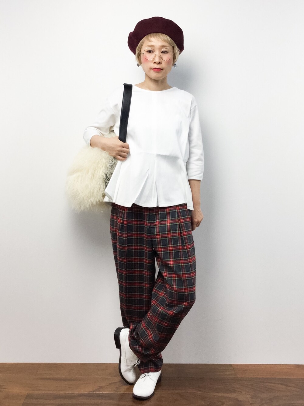 カットソー×タータンチェックパンツ