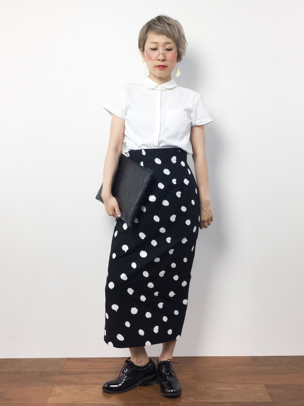 モノトーンコーデ。シンプルなシャツに、存在感のある水玉スカートを合わせました♪