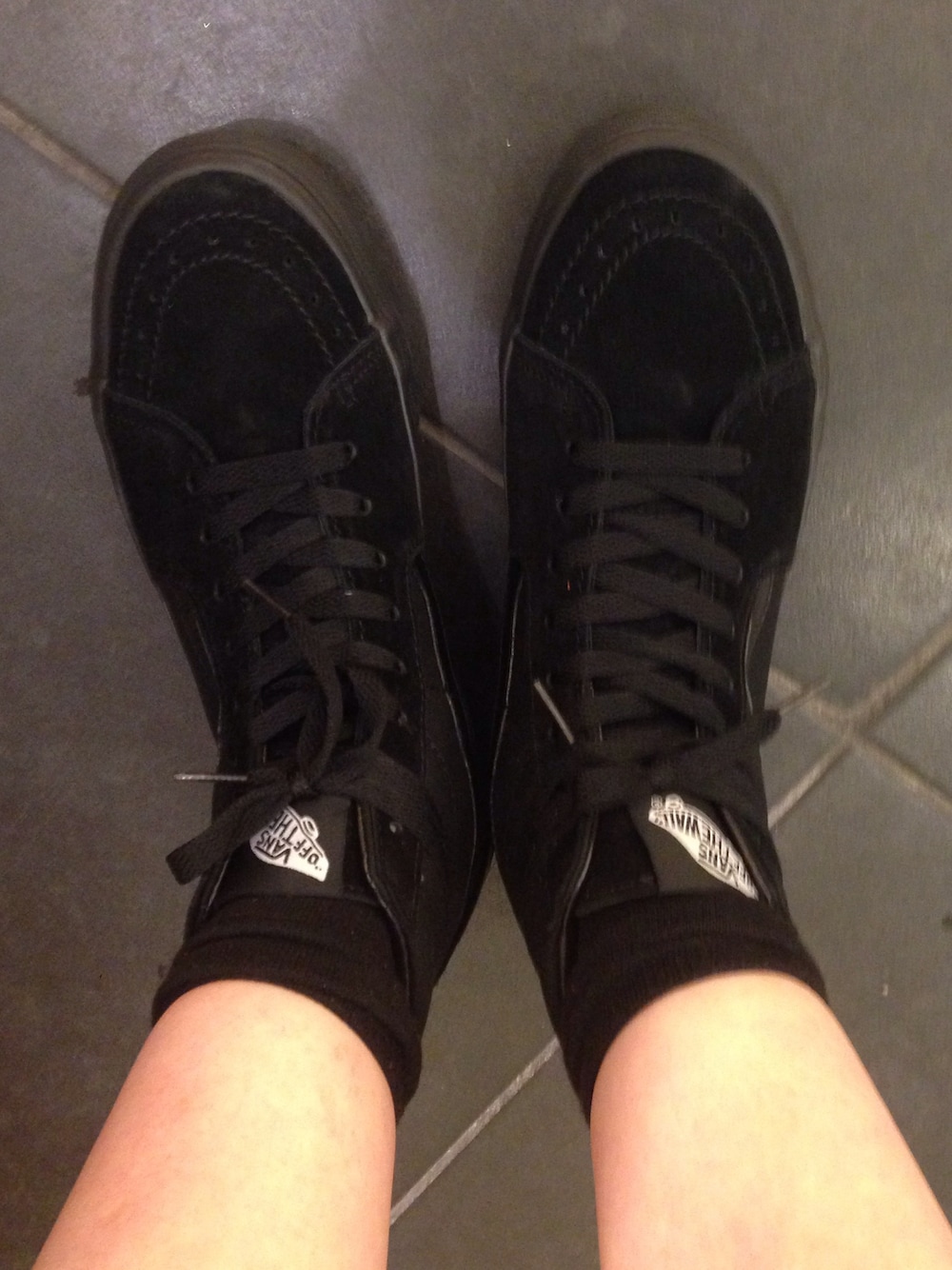 SK-Hiオールブラックのスエード♡ 写真の様に紐を絞るとオールスターぽくキレイ目、緩めるとカジュアル感出てスケハイらしさが出ますね✨
