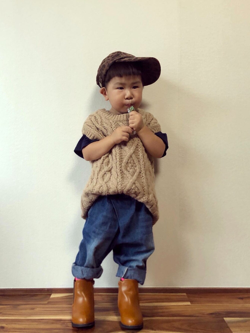 まだまだ日中は暑いので半袖だけれども、色は秋色にて🐆🤎 撮影のお供のゼリーがすくなってきたので購入しないと💦 ご覧いただきありがとうございます☺︎ 仲良くしてもらえると嬉しいです♡ ***** 2y3m 84.0cm 11.0kg *****