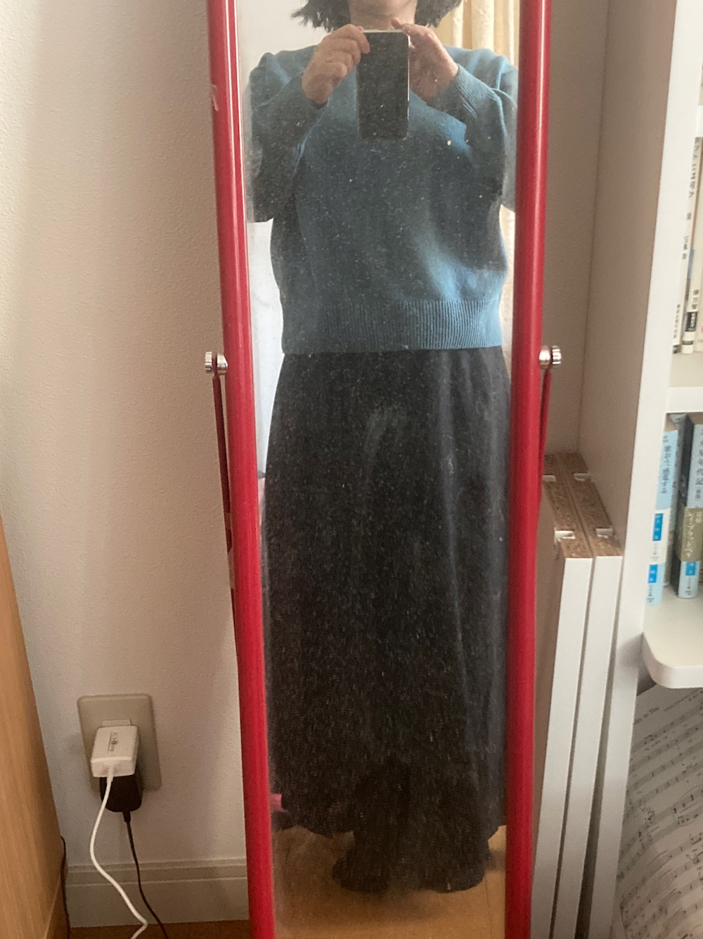 ブルー系のニット/セーター、ブラック系のスカートを着用したレディースの冬コーディネートの1枚目の写真