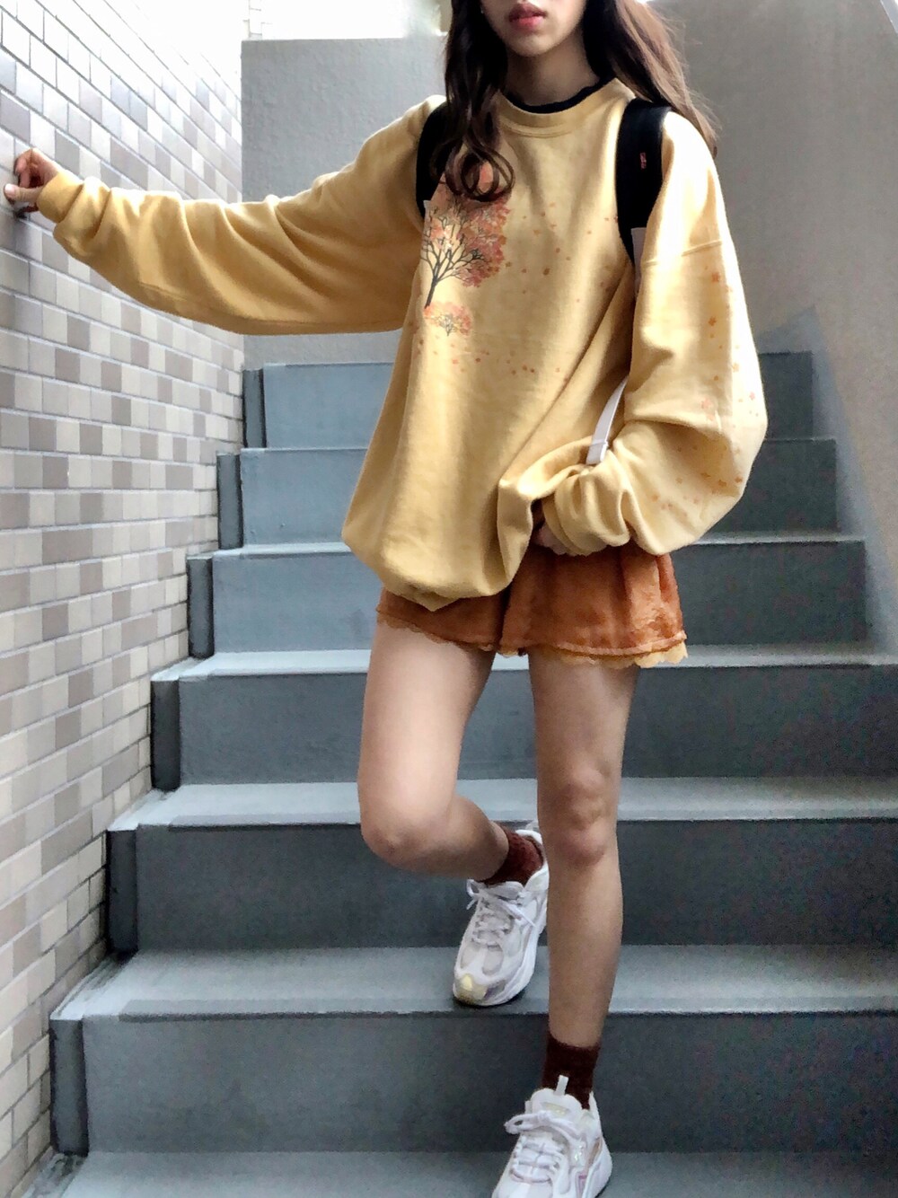 . オレンジのグラデーションコーデに赤の靴下を添え、少しインパクトを