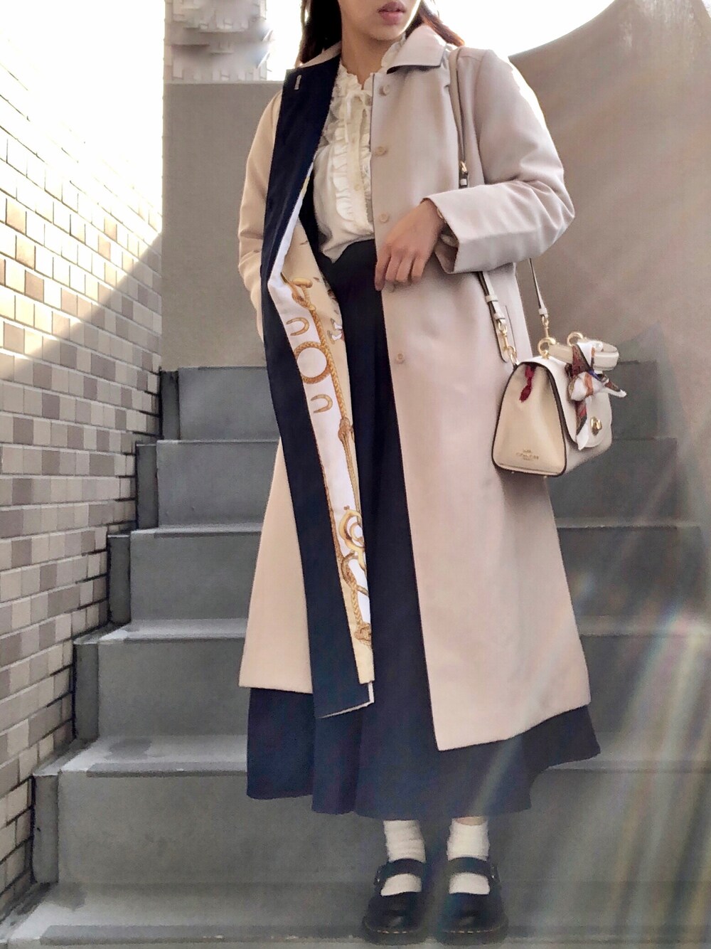 . シンプルになるよう色は一色。後は無彩色。 寂しくならないよう鞄にスカーフを。 . ふわっとコートが広がる瞬間、コートの裏地が見えて人とは一味違うのよ シンプルな服だからこそ、小物が際立ち高級感が上がるの