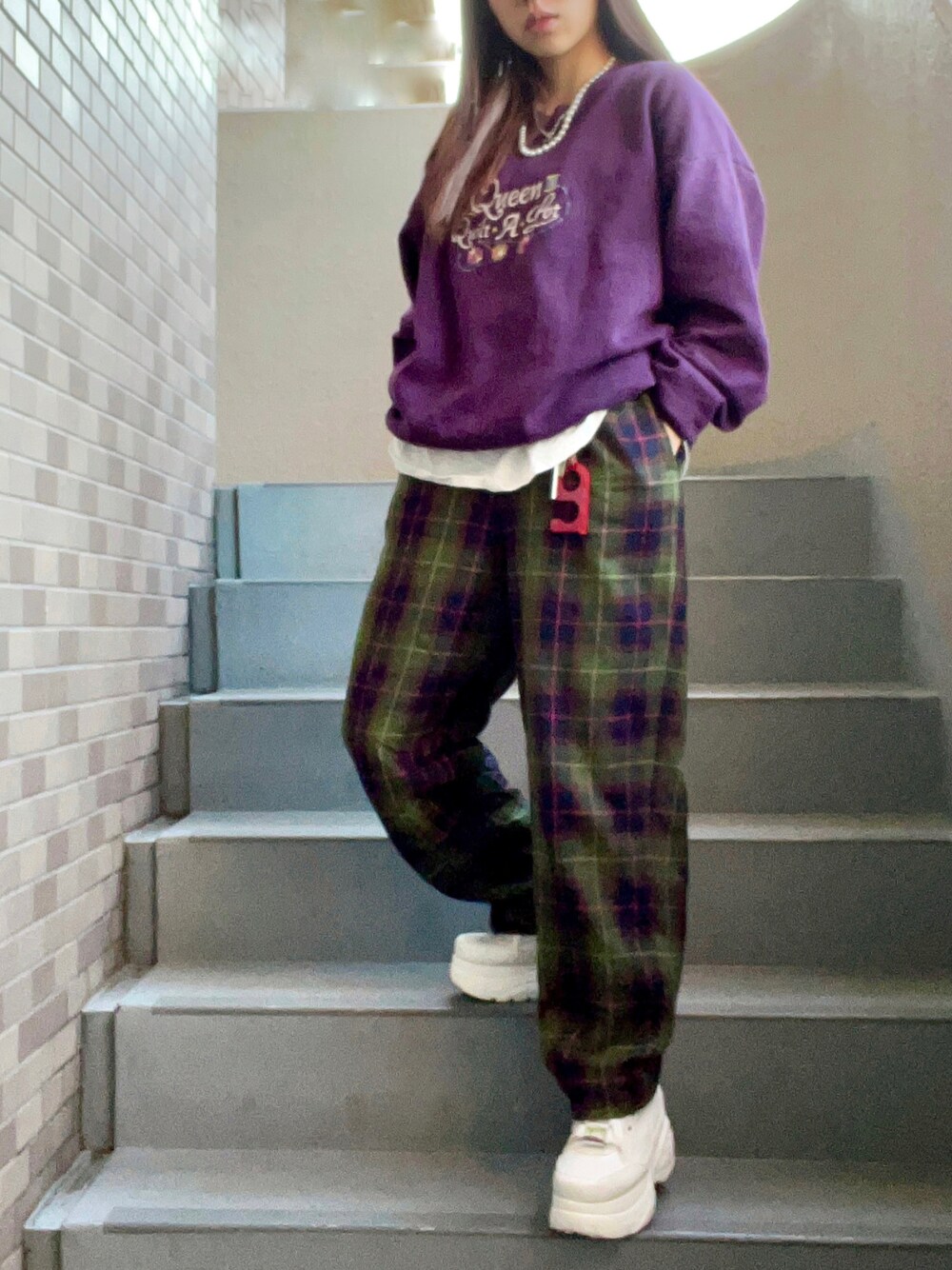 . チェックの色に合わせて紫のトレーナーを合わせてみたよ! 小物は、結構派手な色にしてみたよ〜 困ったら、白でまとめれば完成なのだ