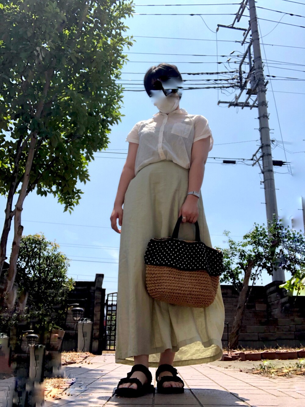 コーデご覧いただきありがとうございます😊 リネンブレンドロングスカートのグリーンです。優しいただき色と涼しくて、とてもお気に入りです!