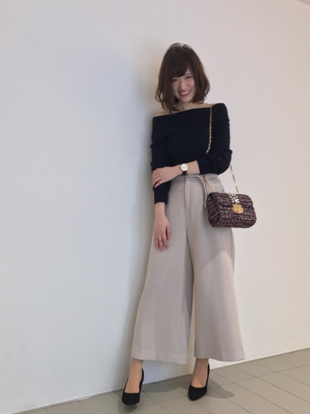 うおchanのニット/セーター「カシミヤ100%オフショルダーニット 」を使ったコーディネート