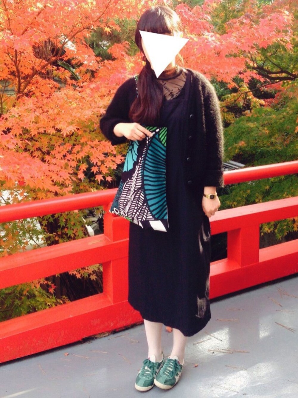 ブラックコーデに好きなカラーの緑色をアクセントに取り入れました。