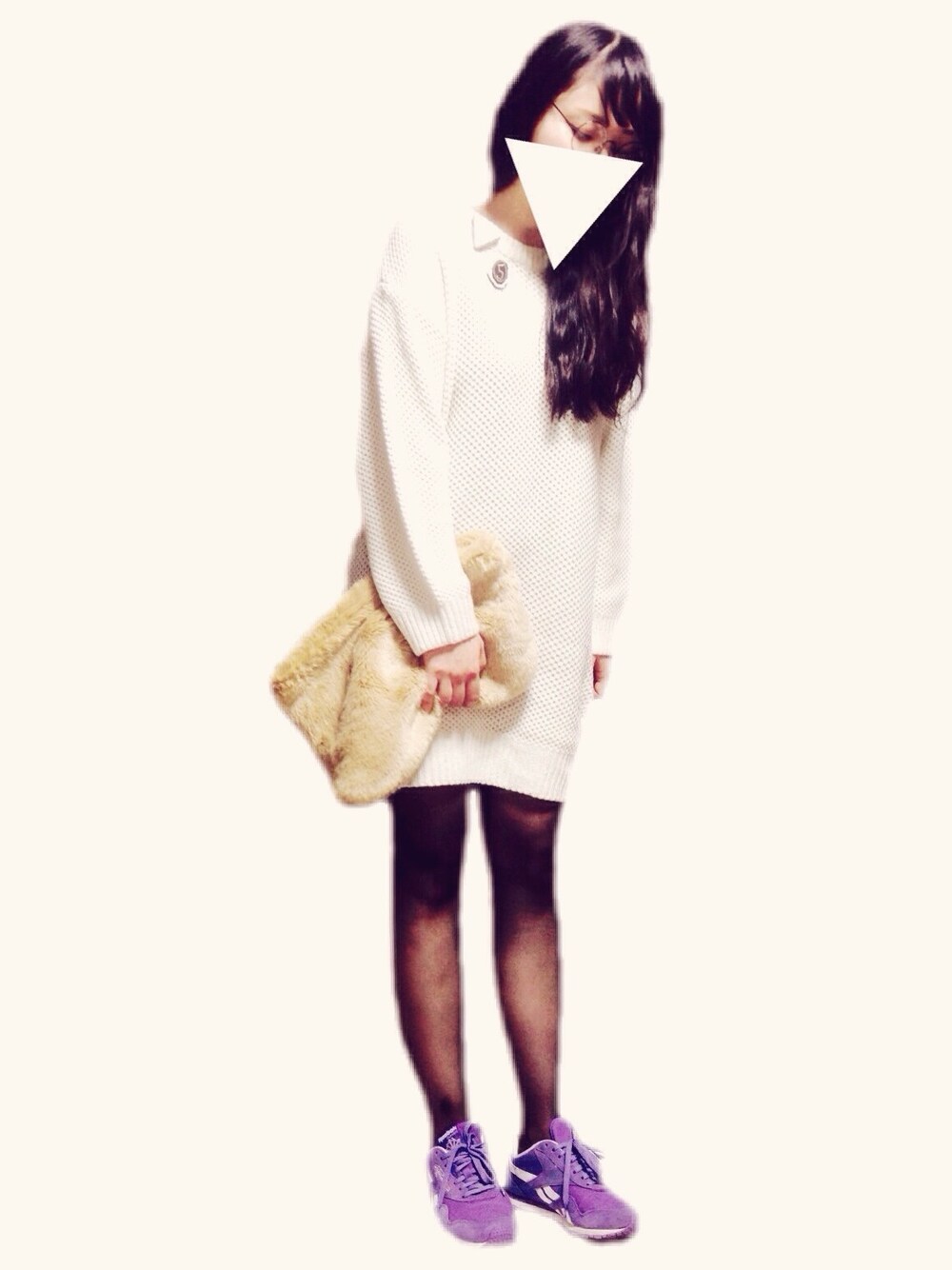 ホワイト系のワンピース、パープル系のスニーカー、ベージュ系のクラッチバッグを着用したレディースの冬コーディネートの1枚目の写真