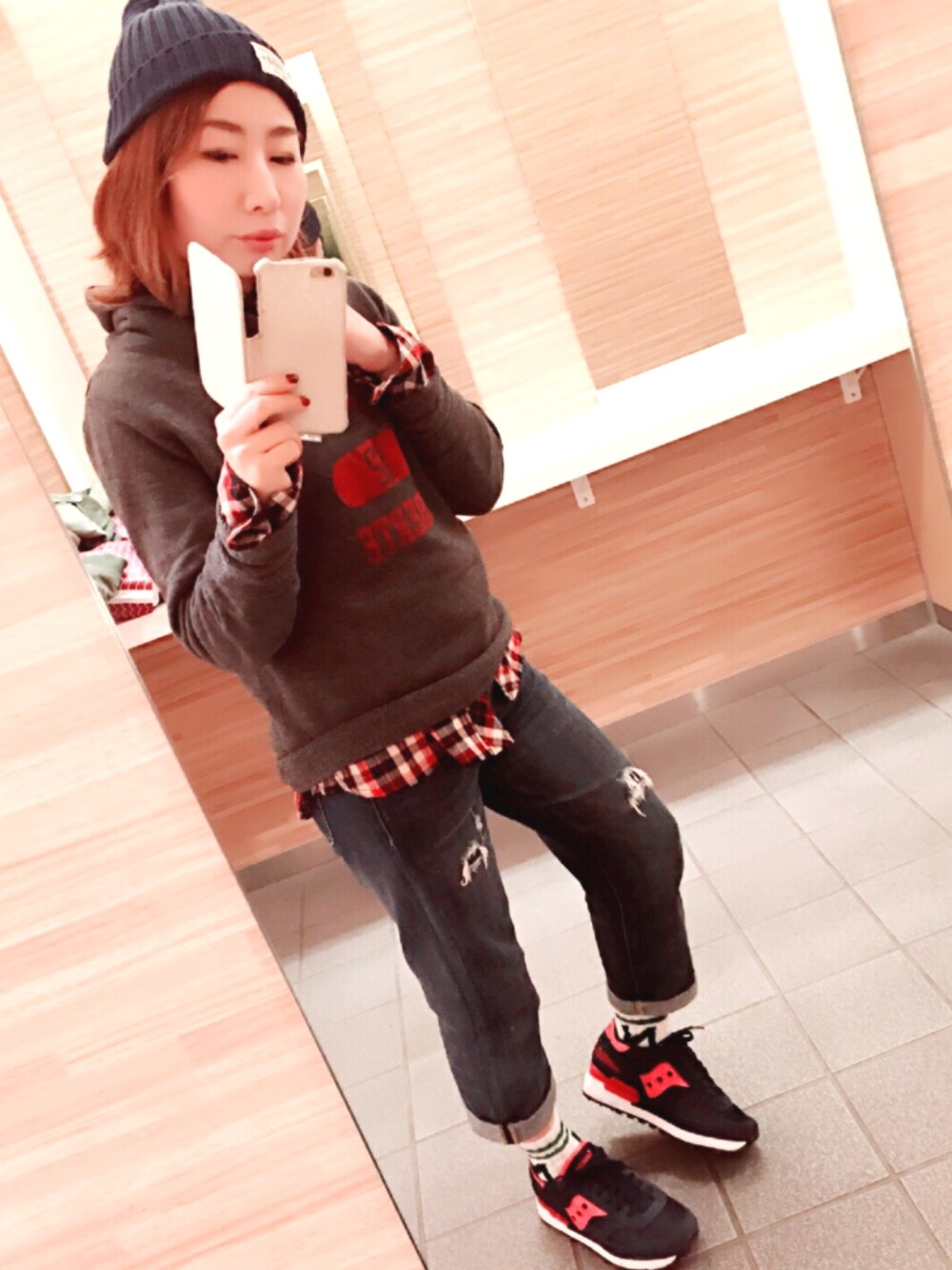 ブルー系のスニーカーを着用したレディースの春コーディネートの1枚目の写真