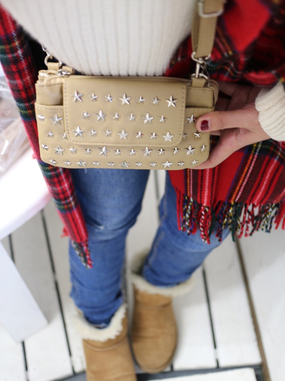 始めてみました。 ひとまず仕事中の防寒コーデを載せてみるの巻♡ 動きやすくあったかの格好。 スタースタッズのウォレットショルダーbagはお店の1番人気商品です♡