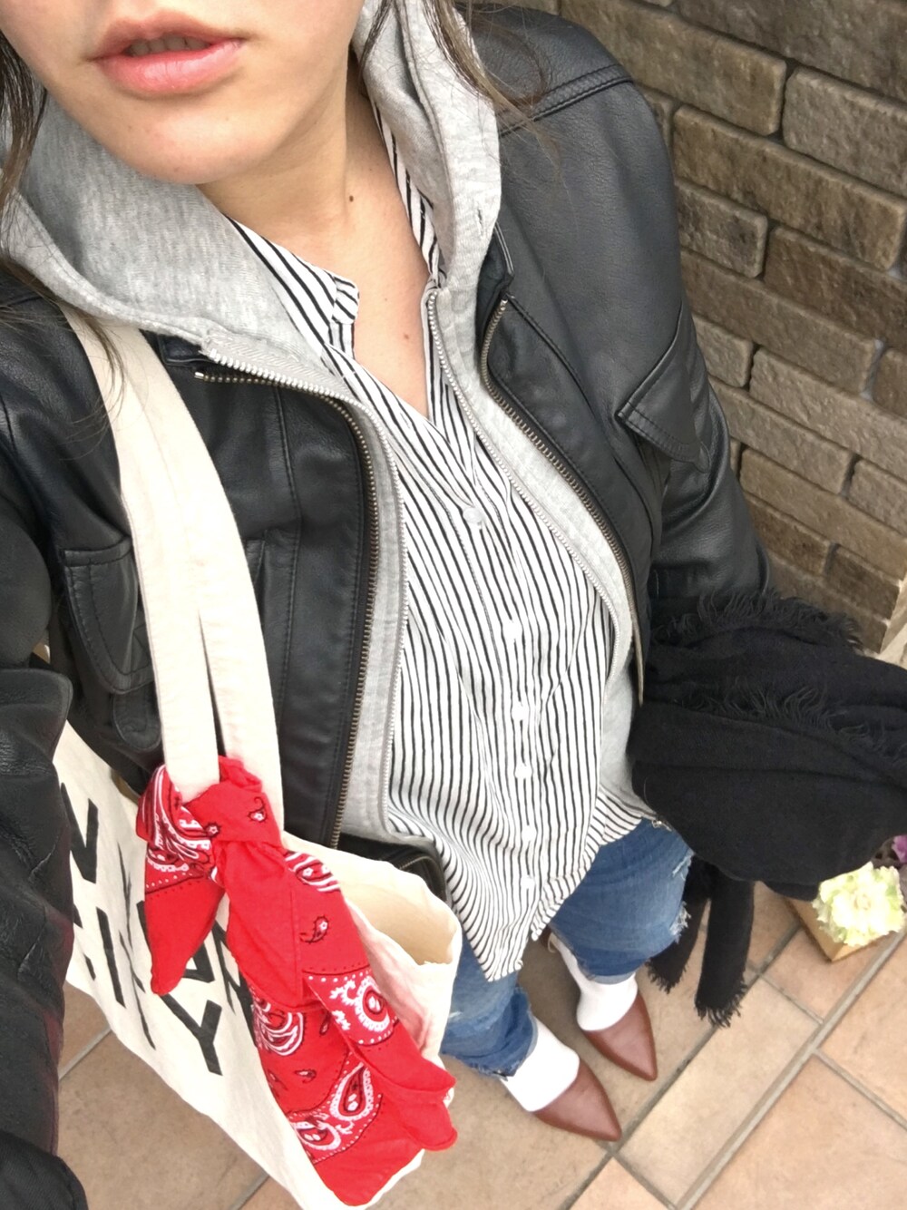 春めかしい格好をした日に限って寒いんです⛄️ ストライプシャツは、後ろが長くてお尻かくせるのがいいヽ(・∀・)ノ