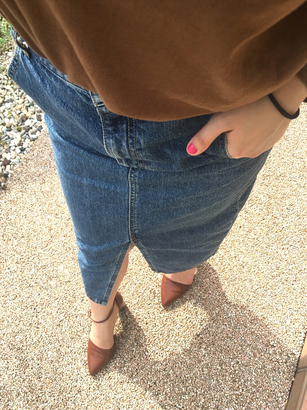ピタピタデニムスカート😆 前に入ったスリットがお気に入り💞 でも足が開かないから車乗りにくい😭 パツン!てなってます。 気に入ってるのにおやすみの日にチラッと履くだけスカート(*゚∀゚)=3