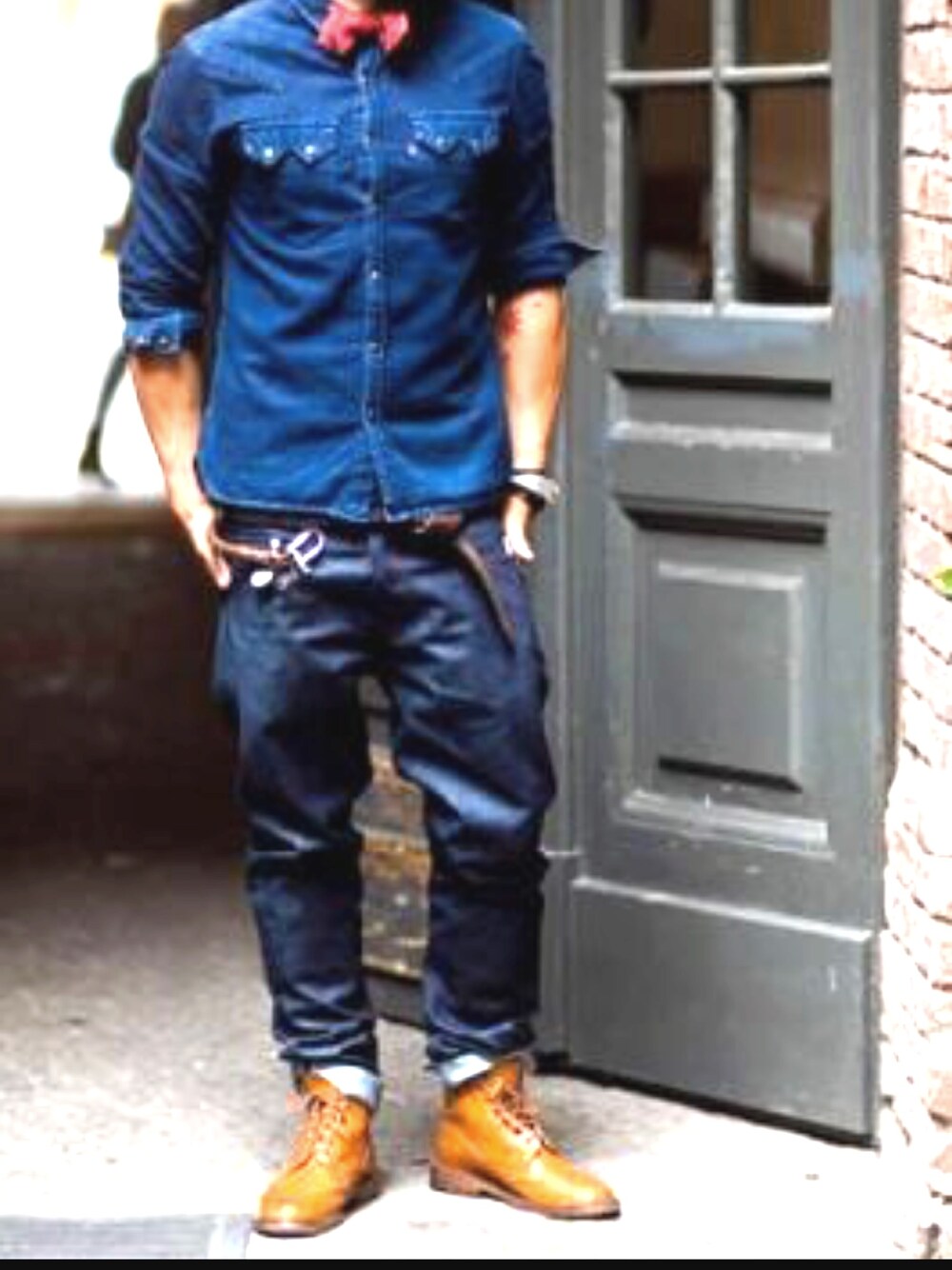 ブルー系のデニムパンツを着用したメンズの春コーディネートの1枚目の写真