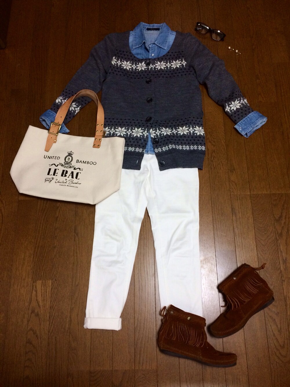 #シャツ×ニットのタグから連想したコーデ❗️ いまいち•••😩 バッグが諸悪の根源かな💦 手持ちのものでコーデするって難しい😢