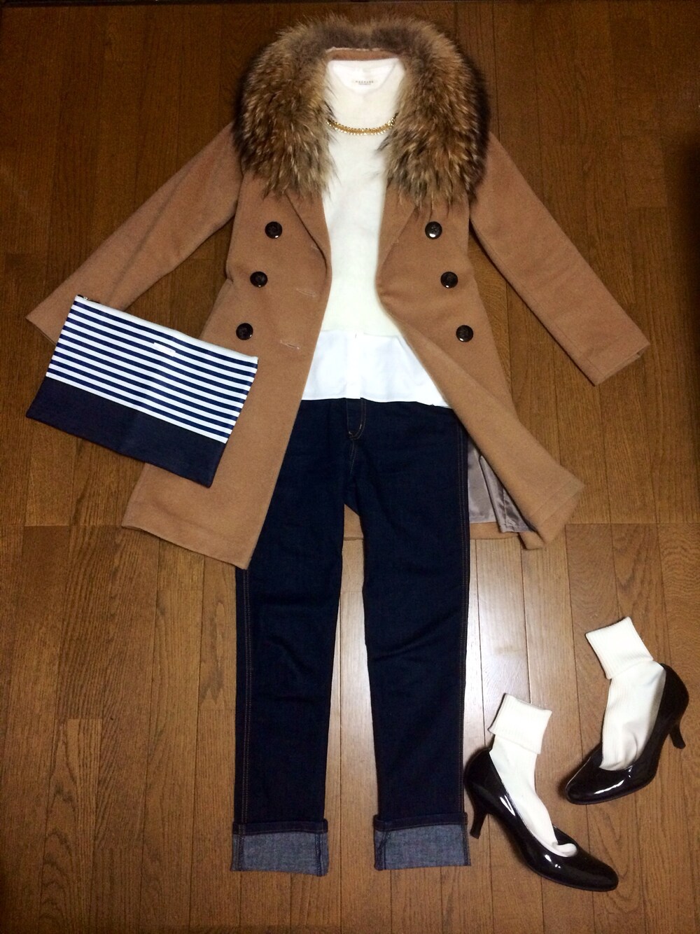 コートとファーは別ブランドだけど、しっくりきてお気に入りの組み合わせ😊 寒いこの時期も靴下を履けば、ヒールも大丈夫❗️