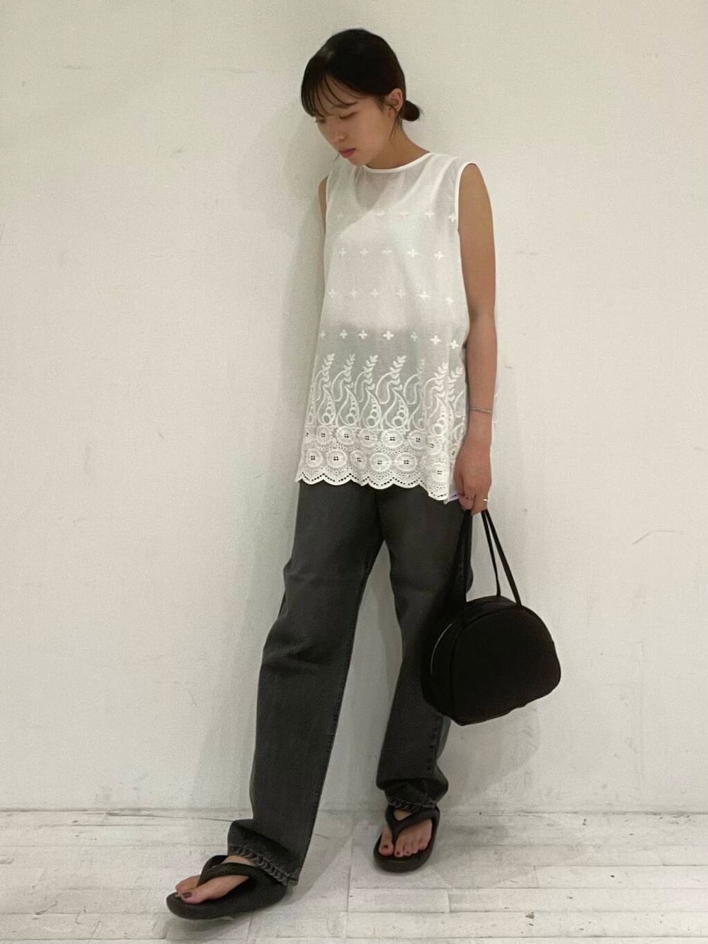 ◎刺繍ノースリーブプルオーバー とっても可愛い刺繍の入ったトップスです✨ 生地も刺繍も全て綿100%とこだわりの商品で、 着心地が良いです! 後ろの首元がゴムで伸縮性があるので、着る時に頭が引っかかりません。お尻周りまで隠れる丈感なので、ボトムスを選ばず使っていただきやすいアイテムです! ◎Lee101×DOORS STRAIGHT PANTS ブラックすぎないデニムで、お洒落見えするお色味です! 少しゆとりのあるストレートパンツなので、足を長く見せてくれますし、シルエットも綺麗に見えます✨ 今回は淡BLACKをコーデに取り入れてみましたが、BLACKのお色味も是非チェックしてみてください!
