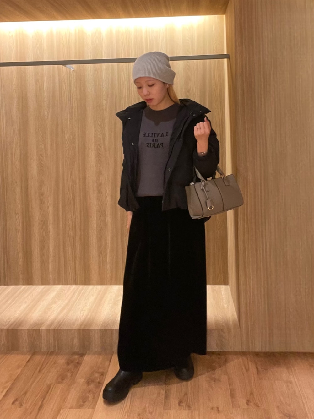 ◯グリーンダウン撥水2wayジャケット フードの取り外し可能な2wayなので、カジュアルもキレイめにも着れるダウンです✨ 程よい光沢感で、着てみると前から後ろにかけて少し落ち感のあるシルエットで上品な雰囲気にしてくれます! グリーンダウンは新毛以上にきれいな羽毛で、環境にも配慮しつつ快適な保温性を維持します ◯ロゴソフトニットプルオーバー 滑らかな質感で、大人な印象を与えるロゴニットです✨ 程よくフィットしてくれるのですっきり見えします!今回使用したチャコールの色味はロゴニットでも大人で上品な雰囲気を纏えるのでオススメです! ◯レーヨンシルクベルベットスカート 着回ししやすいIラインのスカートで、柔らかい質感なので着心地も良いです! ウエストは総ゴムですが、シンプルで落ち感のあるシルエットなのでキレイめな印象になります! 参考になれば、幸いです♪