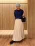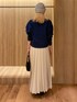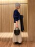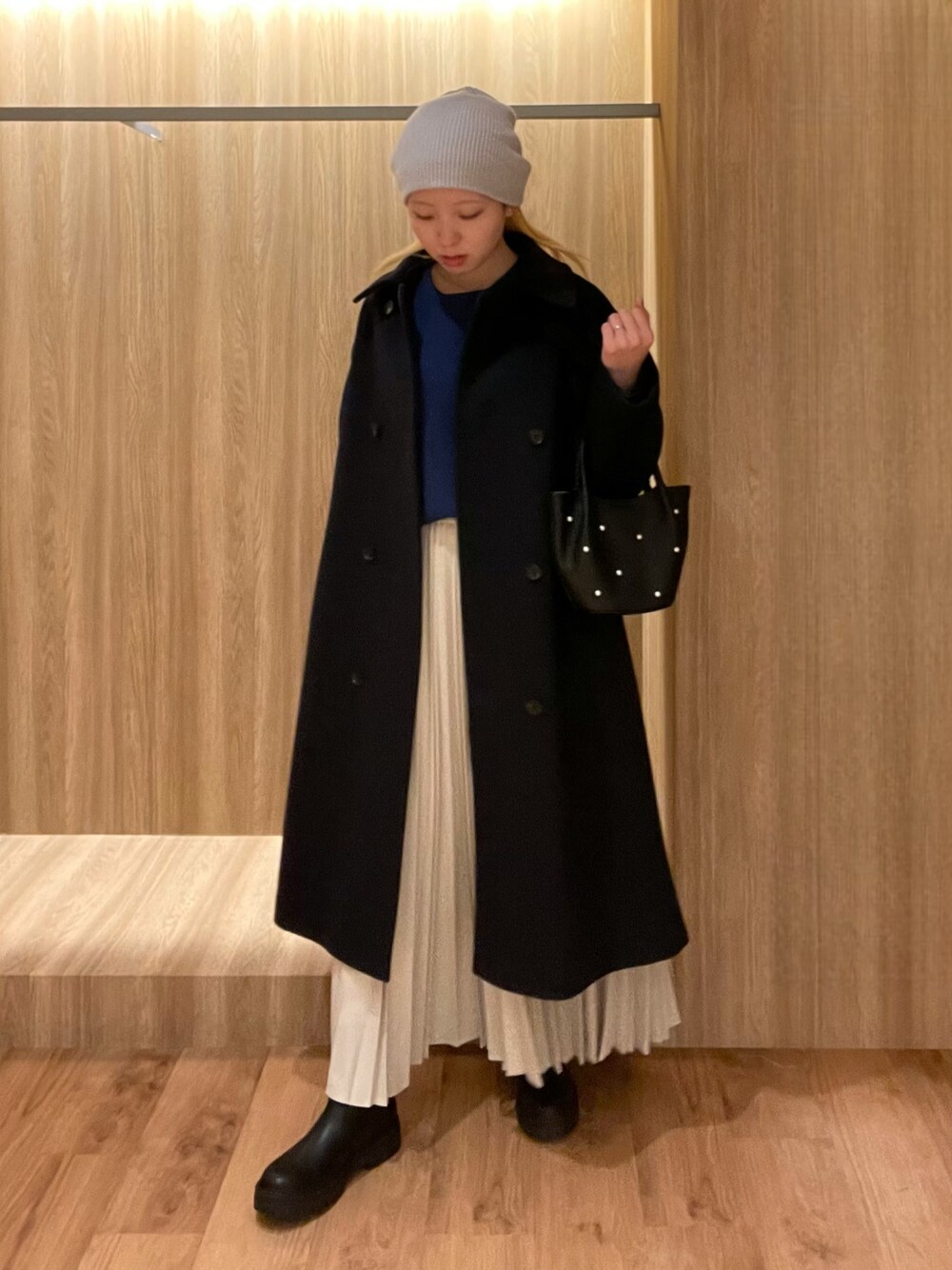 ◯ウールロングコート 上質なウールを使用したシンプルな形のロングコートです✨ 深めなネイビーのお色味なので、モノトーンコーデもカラーコーデでも合わせられます! 見た目より軽い着心地で、アームホールにゆとりもあるのでトップスにボリュームあるものも着ていただけます。 ◯ショート丈コンパクトニット 程よくフィット感のあるコンパクトニットなので、パンツやスカートなど色々なボトムスと合わせられます✨ ブルーのお色でも首元やシルエットが上品なので、大人っぽい印象をまとえます! ◯ツイルプリーツスカート 程よく広がりのあるシルエットと生地の落ち感で高級感あるコーデになります✨ 昨年人気のあったプリーツスカートをプリーツ加工が取れにくくアップデートしました! ウエストは総ゴムと調節可能な紐もついているので、履き心地抜群です! 参考になれば幸いです♪