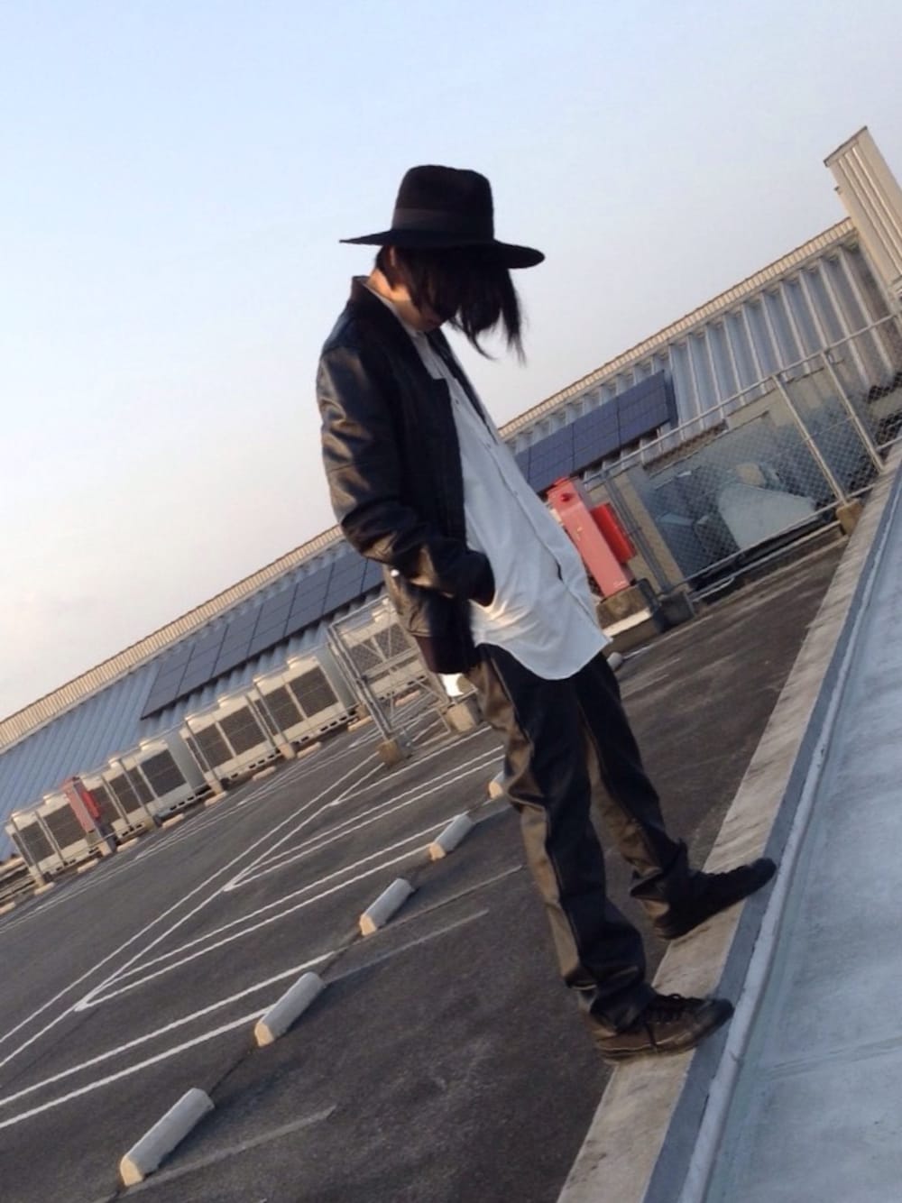 レザーのセットアップです。 今季流行のMA-1を敢えてイージーパンツで合わせてみました。 MA-1は本革レザー、イージーパンツのPUは新作で意外な履き心地の良さとワイドスラックス風に見えるのがいい感じですww つば広、ロングシャツはヘビロテアイテムですね、 特にロングシャツは伸縮する素材で着心地も良いし、ボタンは敢えて黒。 そして何よりポケットが付いてるのが嬉しいですね!