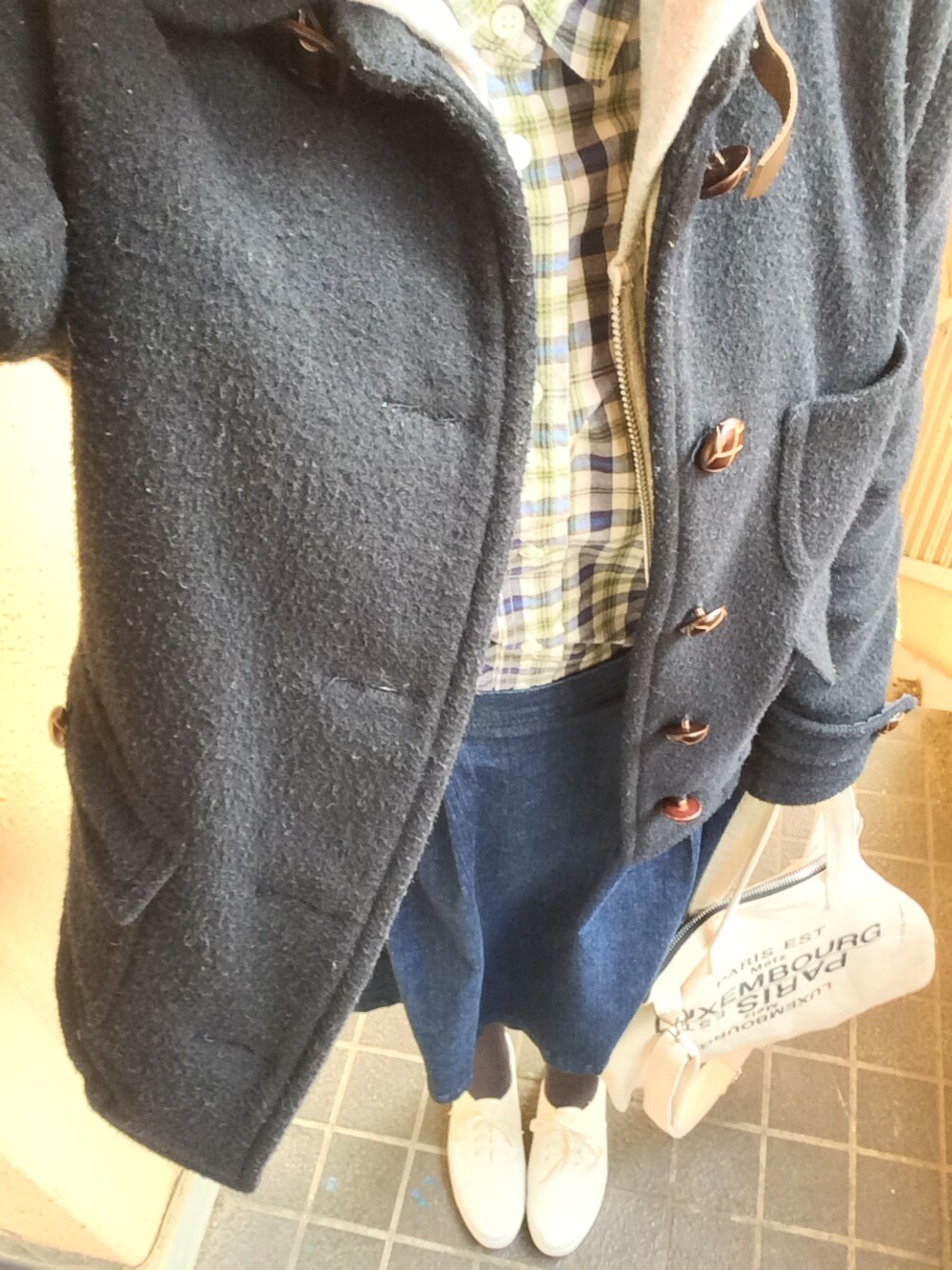アウター : GLOBAL WORK パーカー : UNIQLO シャツ : niko and... スカート : niko and... スニーカー : PAR ICI バッグ : ALL ORDINARIES